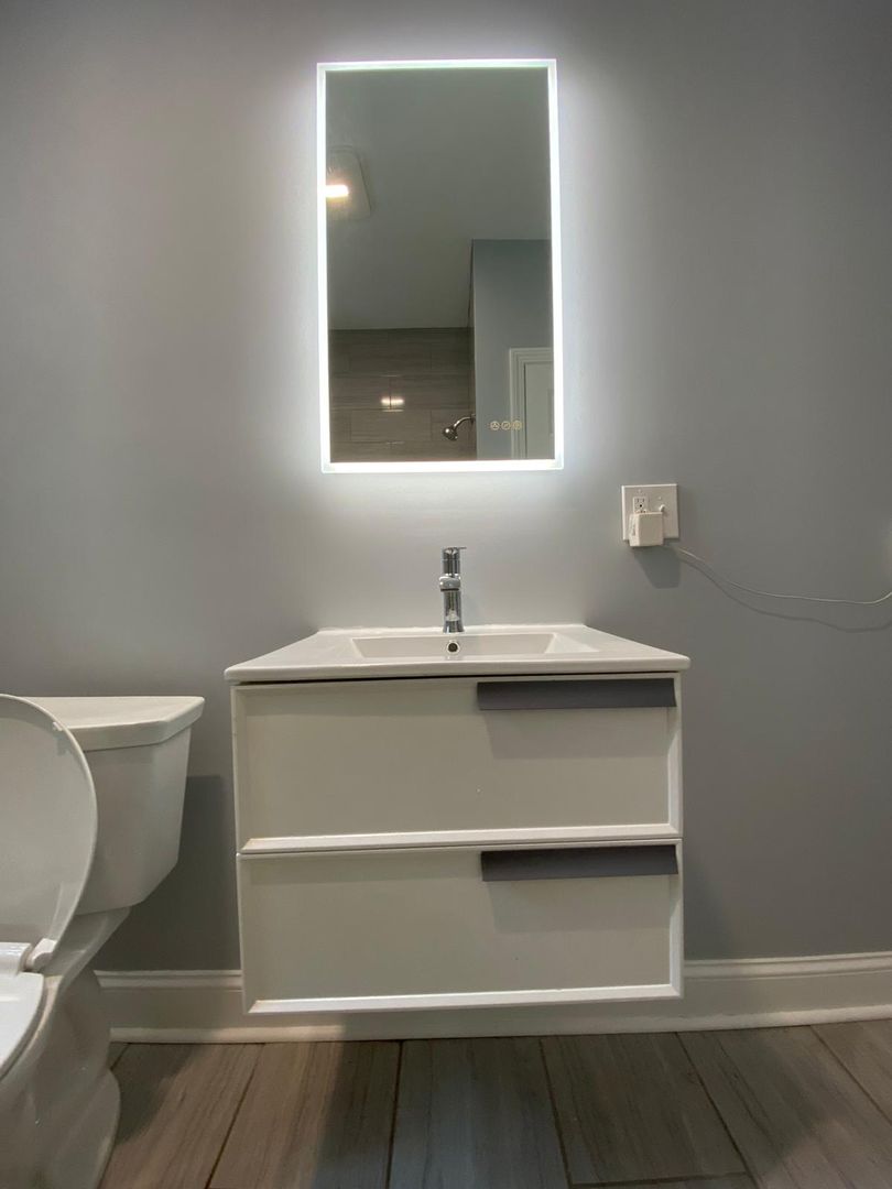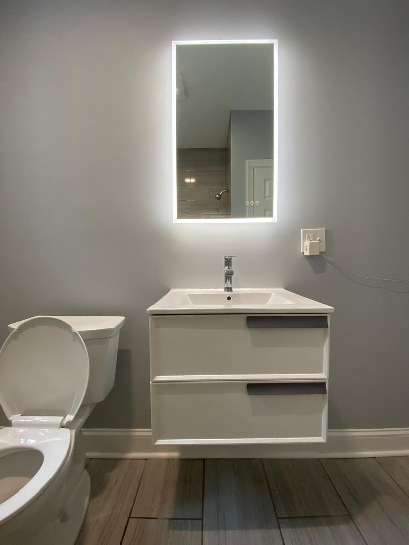 The bathroom has hanging wall a mounted vanity, LED mirror, and high end tub surround.