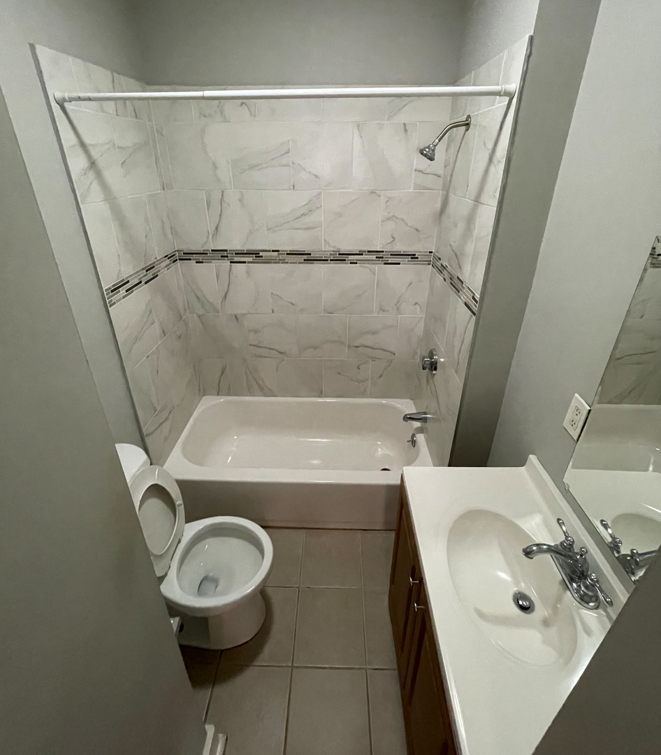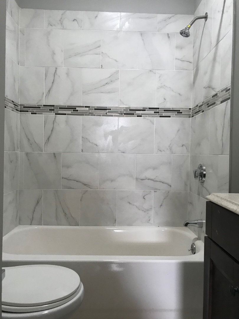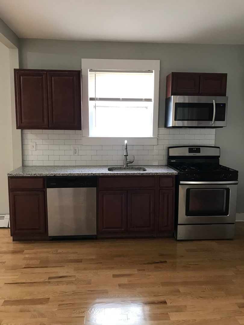 In the kitchen - tile backsplash! high end kitchen cabinets, all stainless steel appliances, including microwave and dishwasher! Bathroom is tile! tile tub surround and tile floor