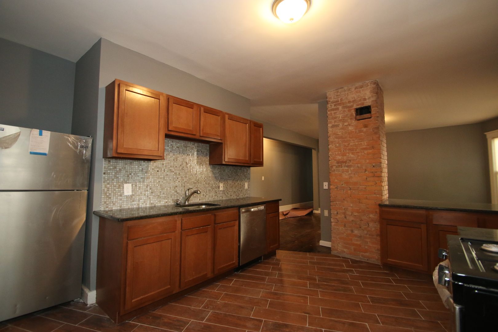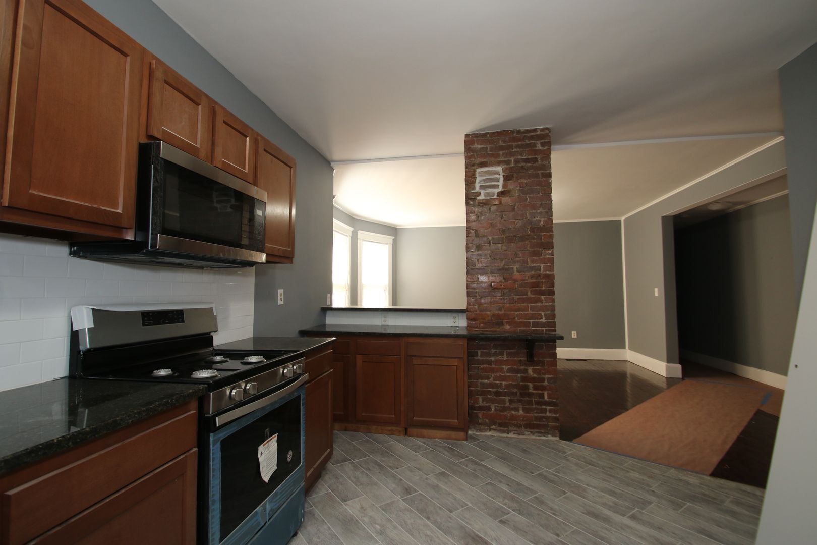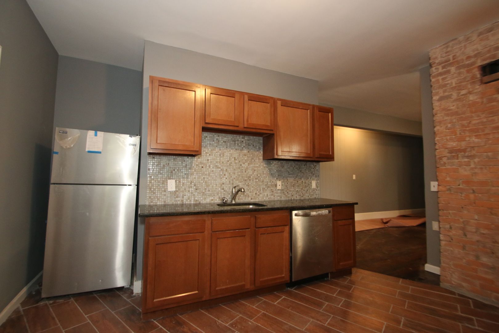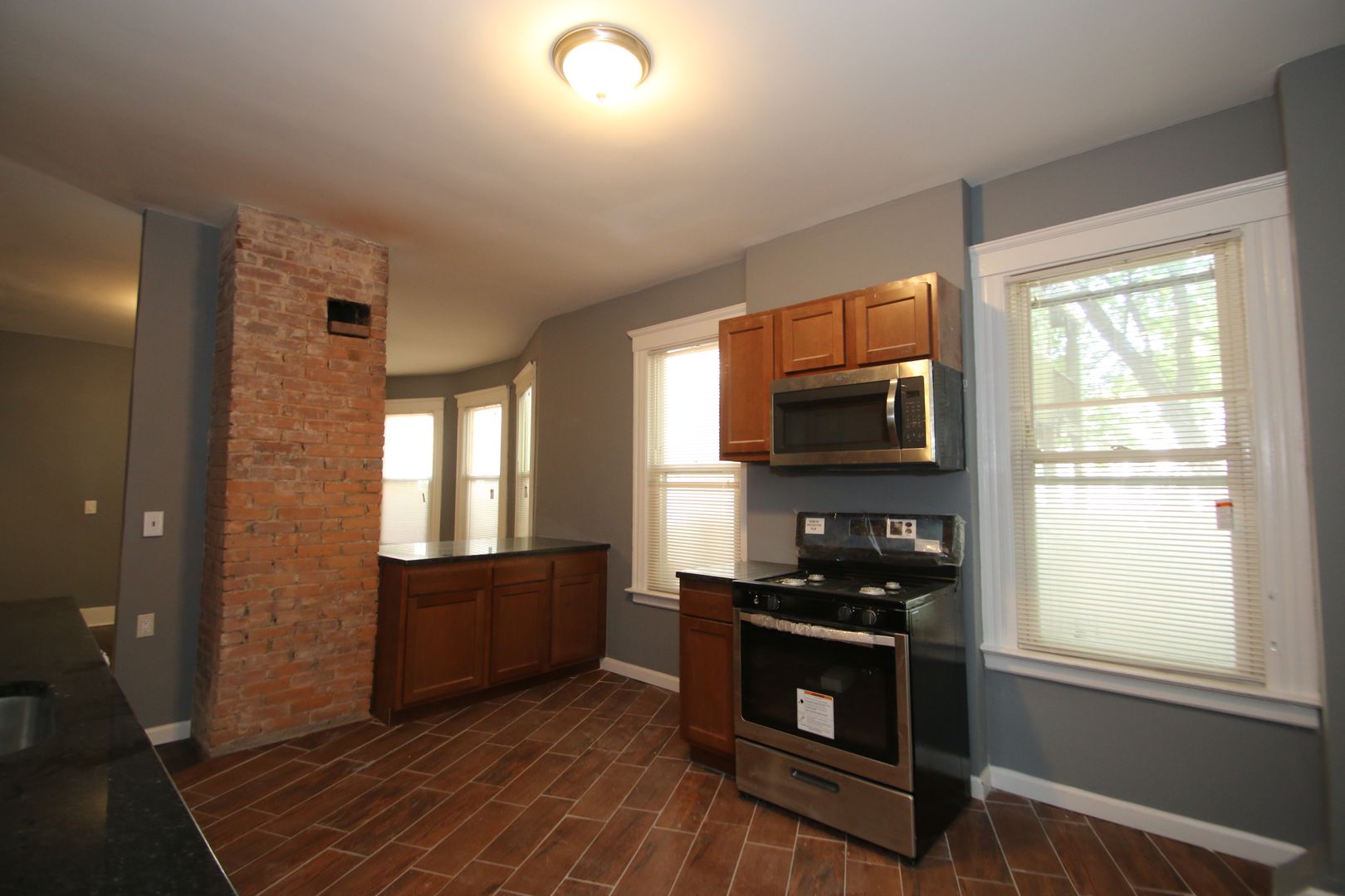 This residence boasts three spacious bedrooms and a full bathroom. The apartment features hardwood floors, exposed brick, and an open concept living. The kitchen has dark wood cabinets, granite countertops, a tile backsplash, and a full suite of stainless steel appliances including a dishwasher, refrigerator, microwave, and oven/range. The bathroom has a tile surround in the shower and a tile floor. The apartment also comes with a washer/dryer in the unit and a separate laundry room for added convenience. Natural gas heat and great natural lighting. Pet-friendly and no security deposit or application fee required. Please note that off-street parking is not available.
