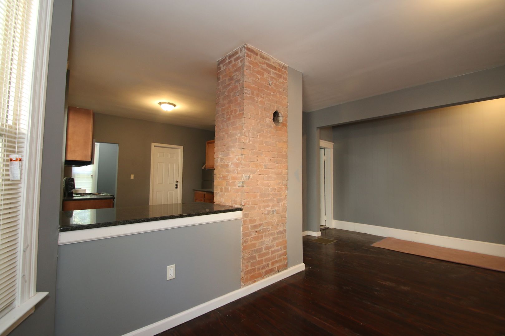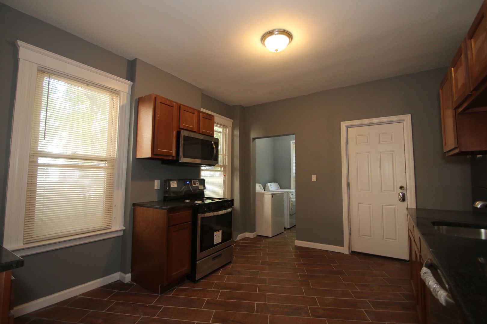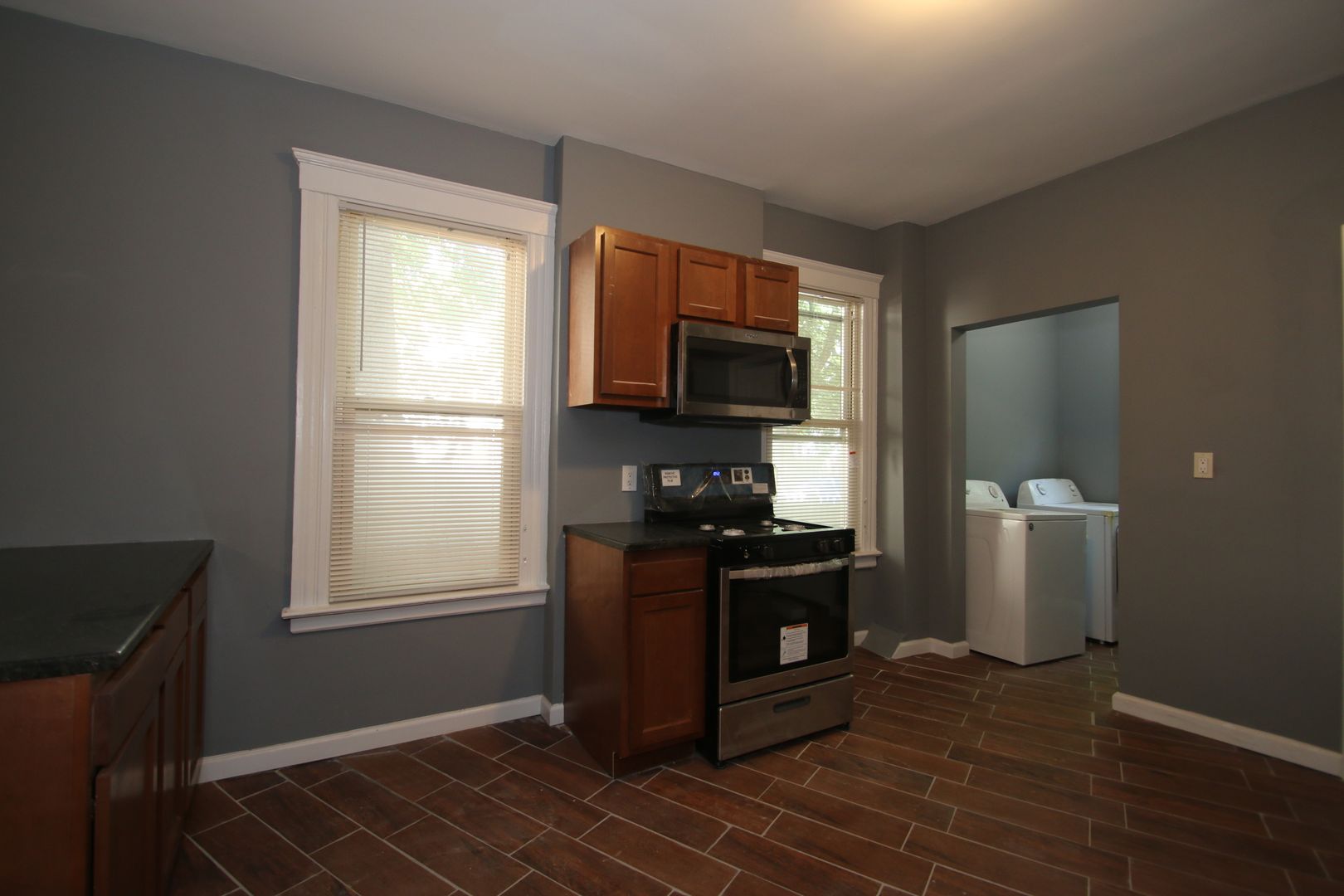 This residence boasts three spacious bedrooms and a full bathroom. The apartment features hardwood floors, exposed brick, and an open concept living. The kitchen has dark wood cabinets, granite countertops, a tile backsplash, and a full suite of stainless steel appliances including a dishwasher, refrigerator, microwave, and oven/range. The bathroom has a tile surround in the shower and a tile floor. The apartment also comes with a washer/dryer in the unit and a separate laundry room for added convenience. Natural gas heat and great natural lighting. Pet-friendly and no security deposit or application fee required. Please note that off-street parking is not available.