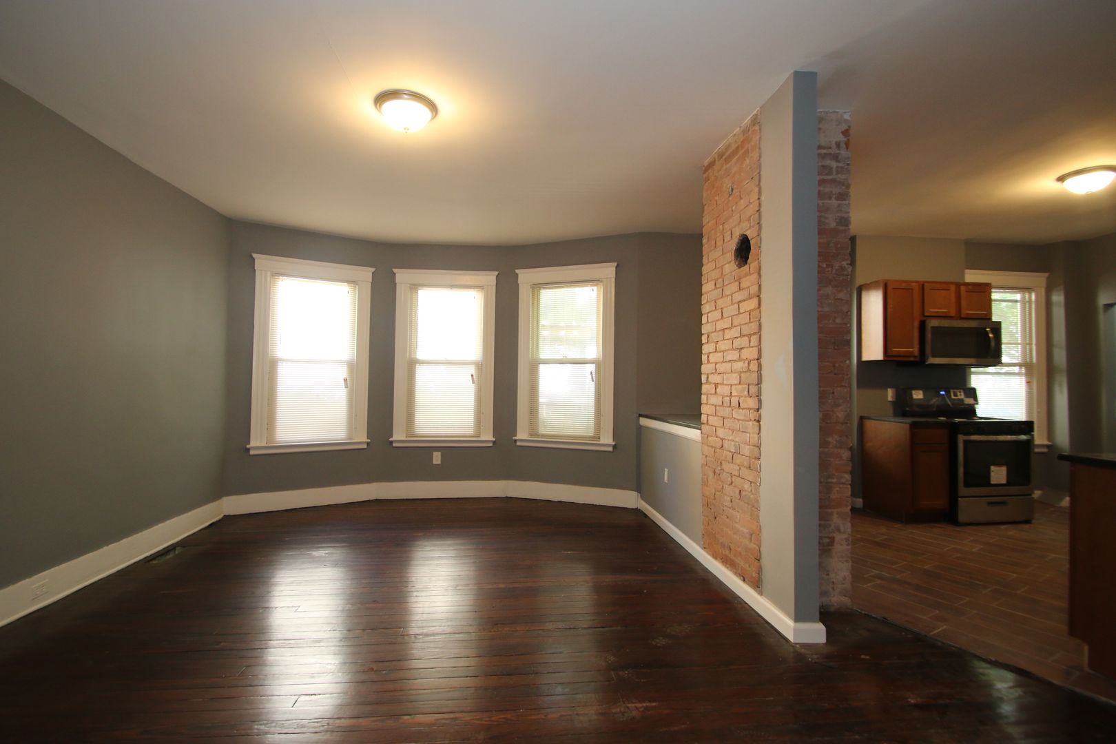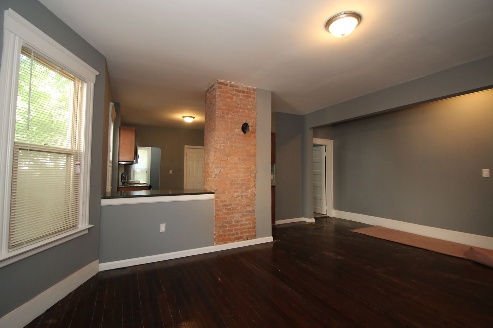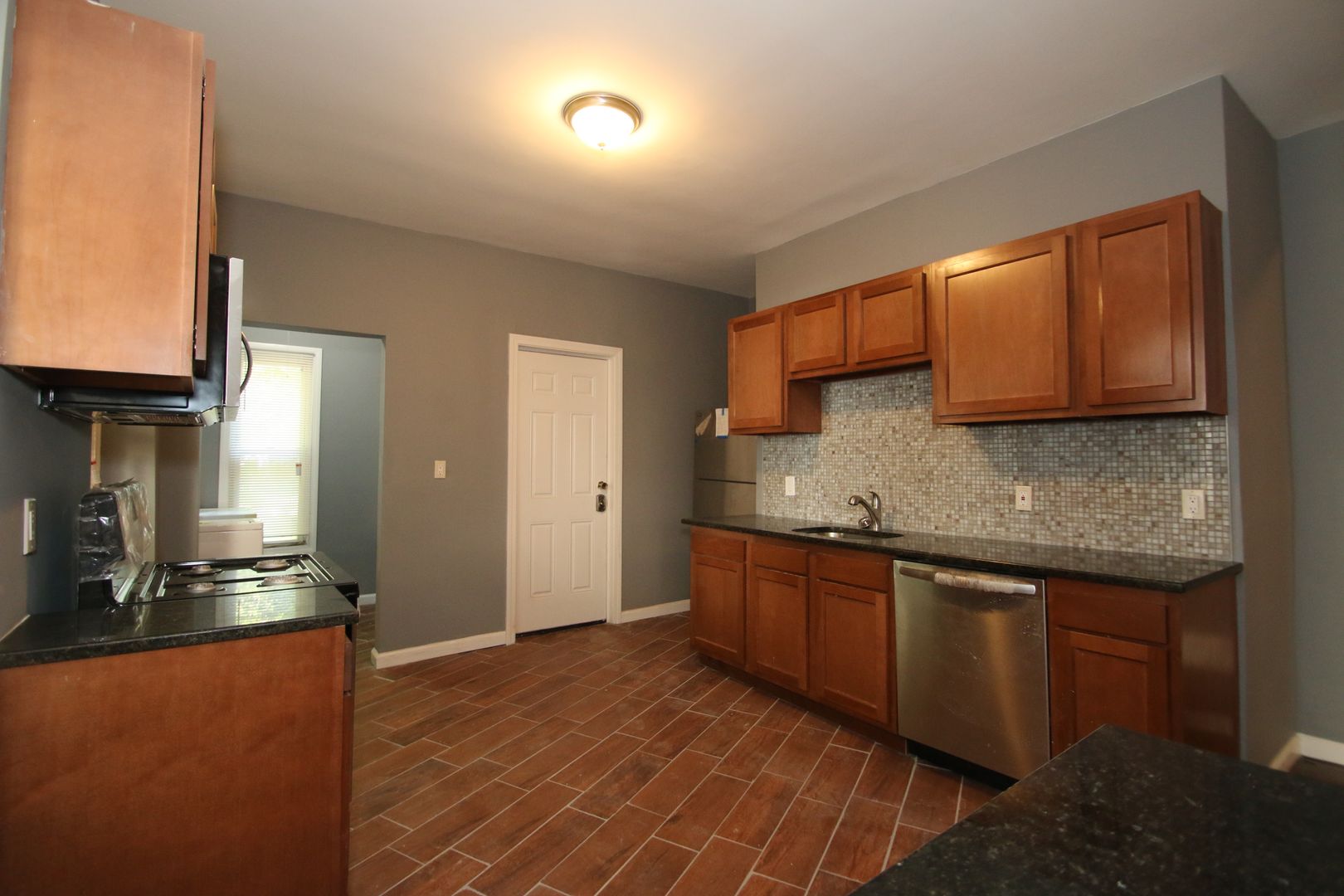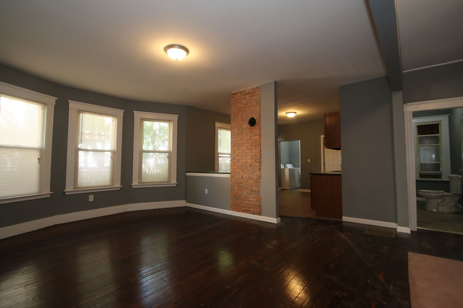 This residence boasts three spacious bedrooms and a full bathroom. The apartment features hardwood floors, exposed brick, and an open concept living. The kitchen has dark wood cabinets, granite countertops, a tile backsplash, and a full suite of stainless steel appliances including a dishwasher, refrigerator, microwave, and oven/range. The bathroom has a tile surround in the shower and a tile floor. The apartment also comes with a washer/dryer in the unit and a separate laundry room for added convenience. Natural gas heat and great natural lighting. Pet-friendly and no security deposit or application fee required. Please note that off-street parking is not available.